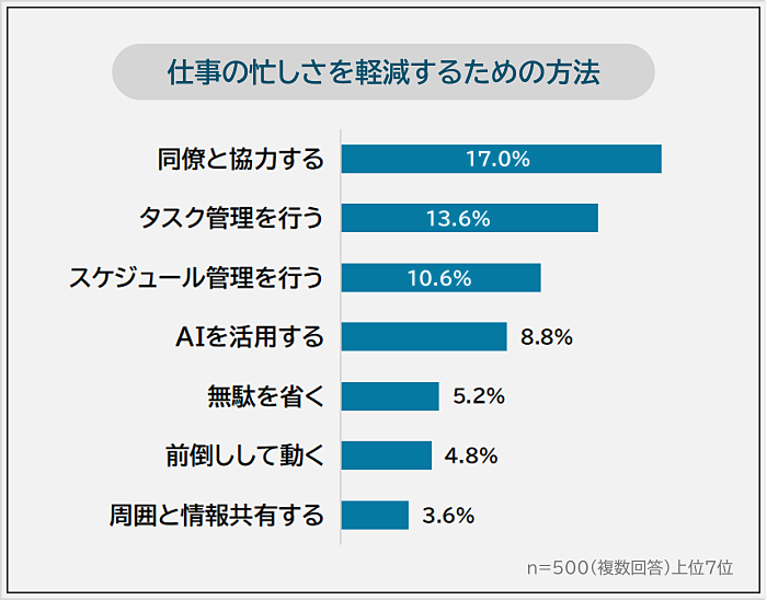 忙しさを軽減するための方法としてもっとも多くあげられたのは「同僚と協力する」だった。タスク管理やスケジュール管理といった個人の工夫を上回る結果となった。