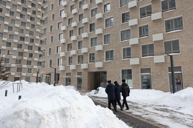 ロシア軍参謀本部情報総局(GRU)のウラジーミル・アレクセーエフ第1副長官に対する暗殺未遂事件が発生した首都モスクワのアパート付近を歩く警察官。2026年2月6日撮影(Contributor/Getty Images)