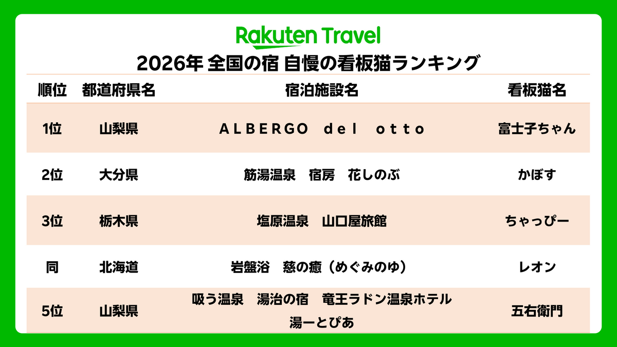 2月22日の「猫の日」を前に、楽天トラベルが「2026年 全国の宿 自慢の看板猫ランキング」を公開した。全国の宿泊施設からエントリーした53匹の看板猫を対象に、楽天会員による3,200票以上の投票によって、会いたい看板猫の日本一が決定。2023年、24年と2年連続で1位を獲得し「殿堂入り」を果たした別府温泉「新玉旅館」の「おもち」のようなカリスマ猫に続く存在になれるのか注目だ。