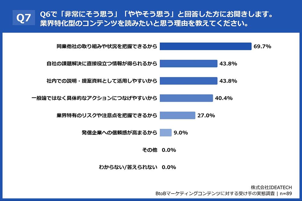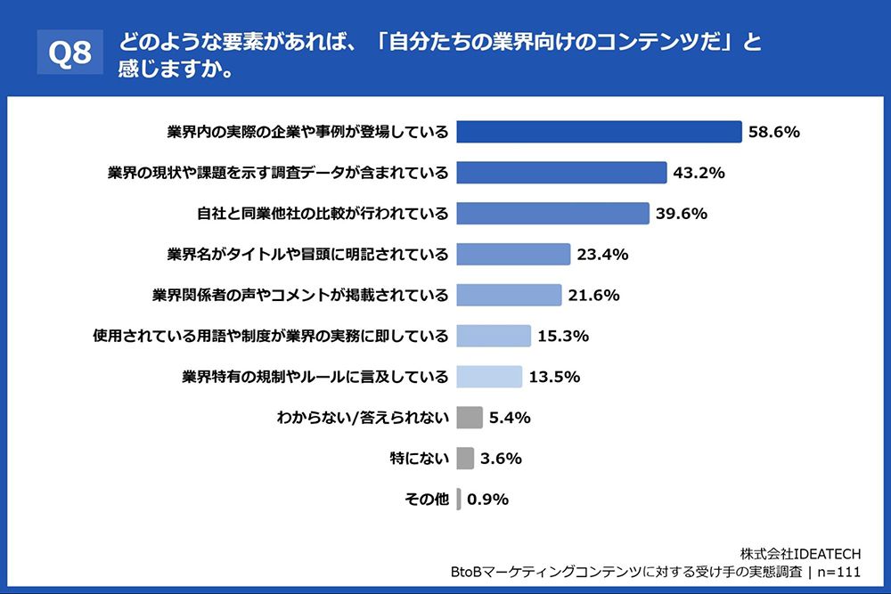 具体的にどのような要素を求めるかを聞くと、もっとも多いのが「業界内の実際の企業や事例が登場する」、次に「業界の状況や課題を示す調査データ」、「自社と他社の比較」、さらに、タイトルや冒頭に業界名が示される、業界関係者の声が掲載される、用語や制度が業界の実務に即している、などがあげられた。