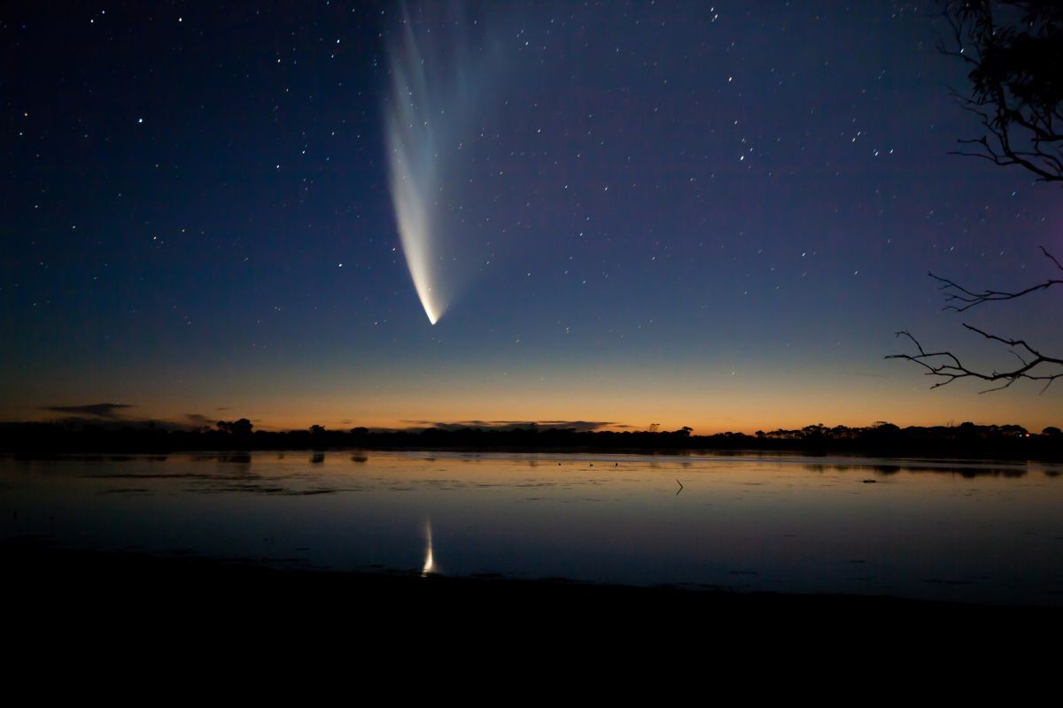 太陽の至近を通るサングレーザーの1つで「2007年の大彗星」と呼ばれたマックノート彗星。オーストラリア南部エア半島にある湖ビッグ・スワンプにて(John White Photos/Getty Images)