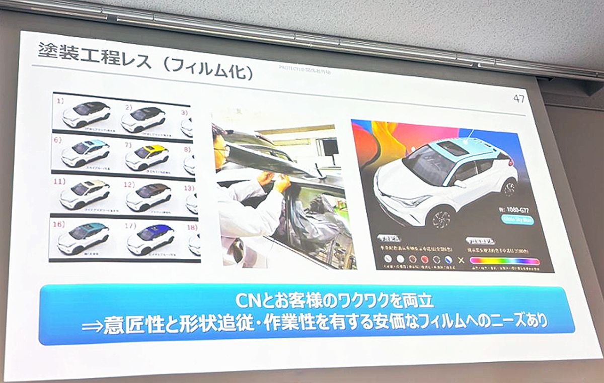 また、車両製造時におけるCO2排出量について加古氏は、最も大きな割合を占めるのが塗装工程だと指摘し、焼き付けや乾燥の工程を短縮する技術や、塗装を粘着剤付きのカラーフィルムに置き換える開発を進めていることを明かした。そして、「フィルムは張り替えて楽しむこともでき、新たな価値を提供する可能性がある一方、複雑な形状に貼るには意匠設計の工夫が必要で、端材も発生します。その活用もセットで考えていく必要があります」と課題を挙げた。