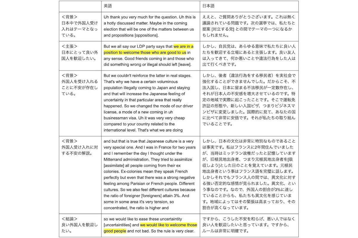 このような英語のコミュニケーション文化の構成に沿った返答を行ったため、途中、日本では外国人受け入れにおいて不安を感じている側面があると話しても、日本が外国人労働者受け入れに消極的になっているという印象は与えず、日本に貢献してくれる、(すなわち)外国人(労働者)は歓迎する、という考えが明確になっていた。
