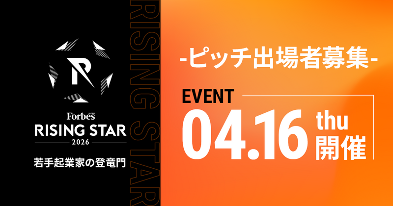 Forbes JAPANは4月16日(木)、創業3年以内の起業家や経営陣によるピッチコンテスト「RISING STAR AWARD 2026」を恵比寿ガーデンプレイスで開催する。3/12(木)まで、ピッチ出場者を募集している。