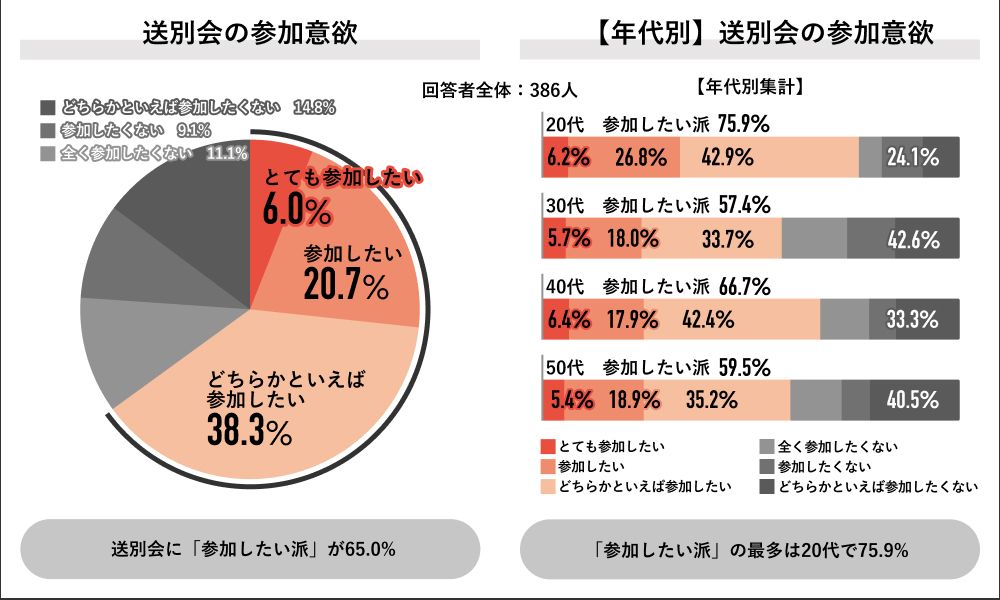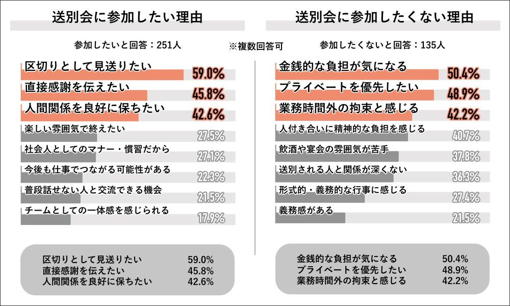 参加したい251人に理由を聞くと、「区切りとして見送りたい」、「直接感謝を伝えたい」、「人間関係を良好に保ちたい」がトップ3。参加したくない135人の理由のトップ3は、「金銭的な負担が気になる」、「プライベートを優先したい」、「業務時間外の拘束と感じる」だった。