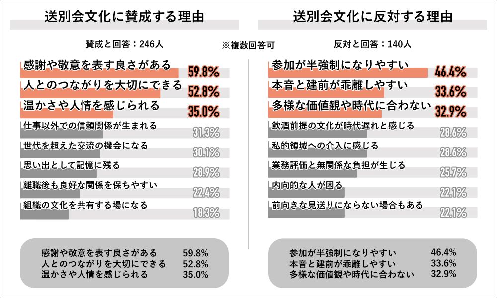 送別会という文化そのものの賛否を尋ねると、63.8パーセントが賛成と答えている。賛成派の理由は、「感謝や敬意を表すよさがある」、「人とのつながりを大切にできる」、「温かさや人情を感じられる」など。反対派は「参加が半強制になりやすい」、「本音と建前が乖離しやすい」、「多様な価値観や時代に合わない」などとなった。