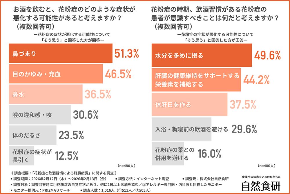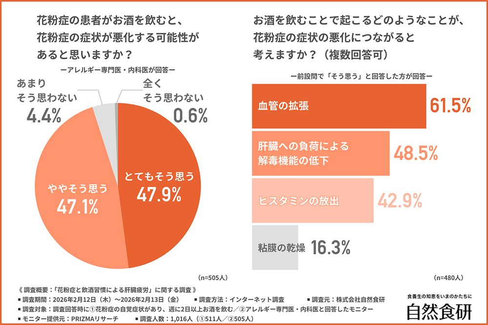調査では、アレルギー専門医および内科医505人にも意見を聞いているが、その約48パーセントはお酒を飲むと花粉症の症状が悪化することについて「とてもそう思う」と答えている。また、「ややそう思う」も約47パーセントで、あわせると9割以上の医師がお酒と花粉症の関連性を肯定している。