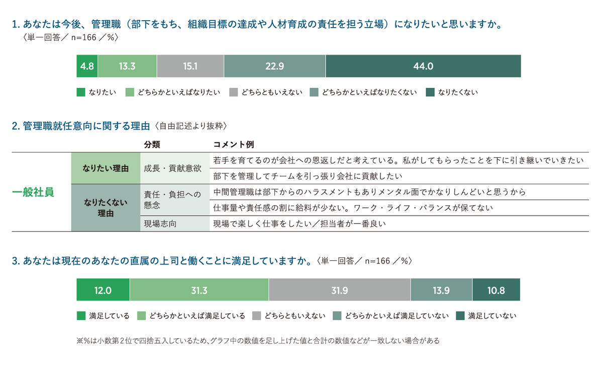 ただし、注目すべき関係がある。現在の直属の上司への満足度が高い一般社員ほど、管理職を前向きに捉える傾向が確認された。上司に満足している群では管理職になりたい割合が高く、そうでない群ではなりたくないとする割合が高かった。
