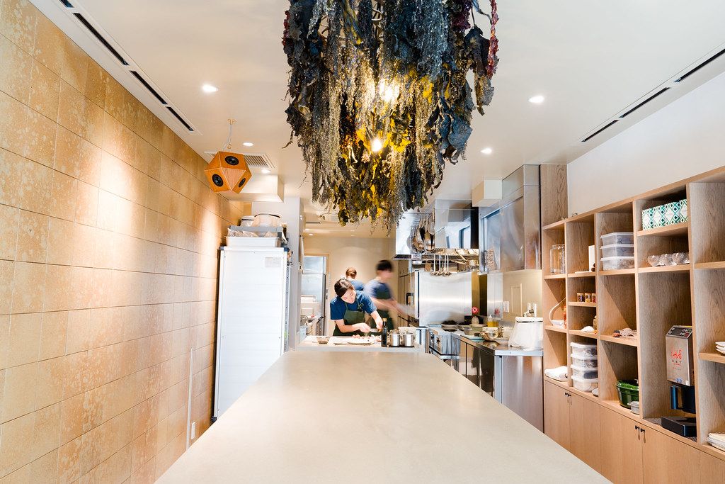 空間づくりにもこだわりがある。店内照明には実際の海藻を使ったシャンデリアが設置され、そのデザインは石川県のデザインチームseccaが手がけた。海に潜って水面を見上げたような揺らぎと光の演出だ。