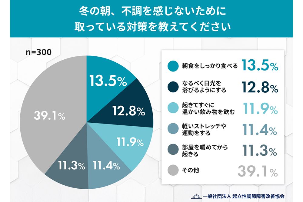 調査に参加した人たちは、自律神経の乱れを意識して、それぞれ自己流の対策を行っていた。朝食をしっかり食べる、なるべく日光を浴びる、起きてすぐに温かい飲み物を飲むなどだ。これらは、「身体の内外から温め、覚醒を促す多角的な工夫」だとして同協会も認めている。