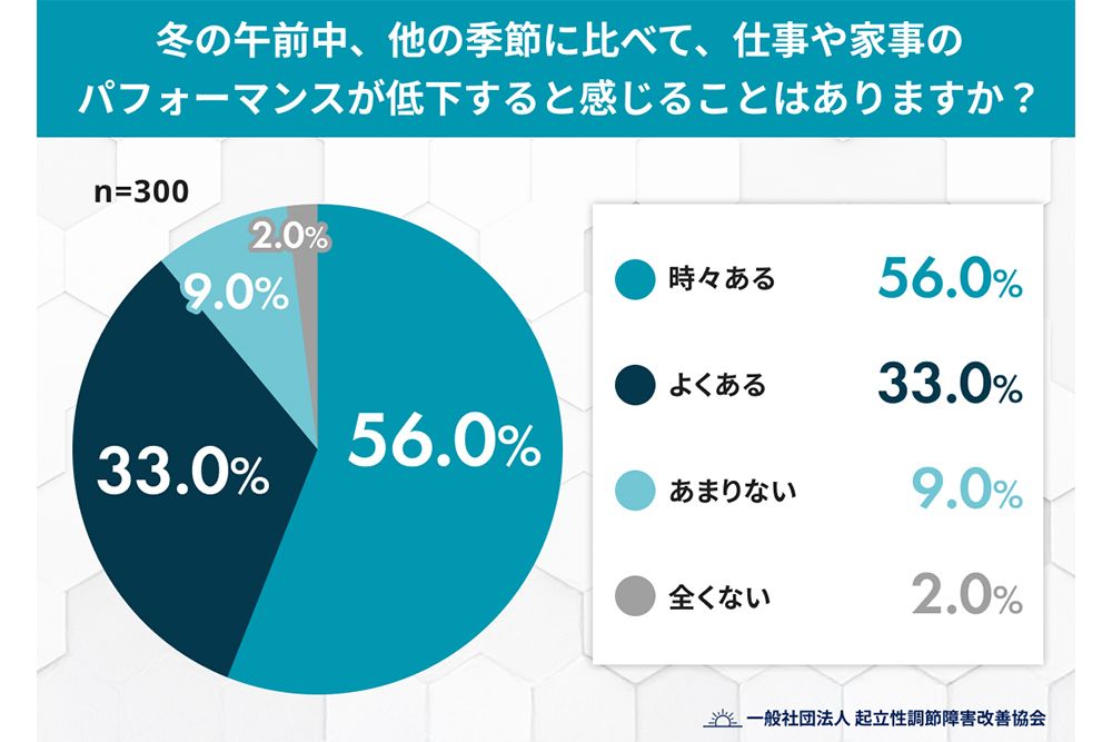 これは子どもだけの問題ではない。一般社団法人起立性調節障害改善協会が全国の20〜60歳代の男女300人を対象に行った調査では、冬の午前中に仕事や家事のパフォーマンスが低下すると感じている人は、「ときどきある」と「よくある」をあわせてじつに98パーセントにものぼる。
