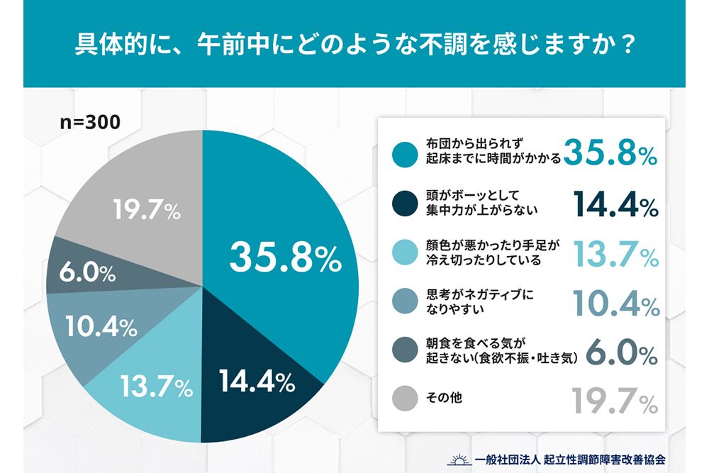症状として多いのが、布団から出られず起床に時間がかかる、頭がボーッとして集中力が上がらない、顔色が悪かったり手足が冷え切ったりするなどだ。単に起きられないだけでなく、「脳の覚醒不足による集中力低下や精神的な落ち込み」などの症状が上位を占めていると同協会は指摘する。