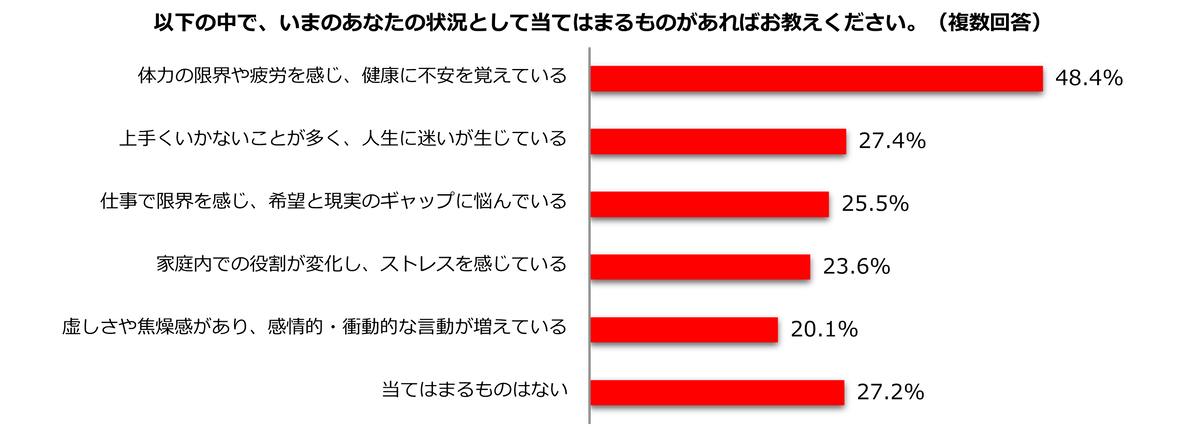 いま自分に当てはまる状況として最も多く挙げられたのは「体力の限界や疲労を感じ、健康に不安を覚えている」で48.4%。ところが2位以下を見ると「上手くいかないことが多く、人生に迷いが生じている」27.4%、「仕事で限界を感じ、希望と現実のギャップに悩んでいる」25.5%と続く。