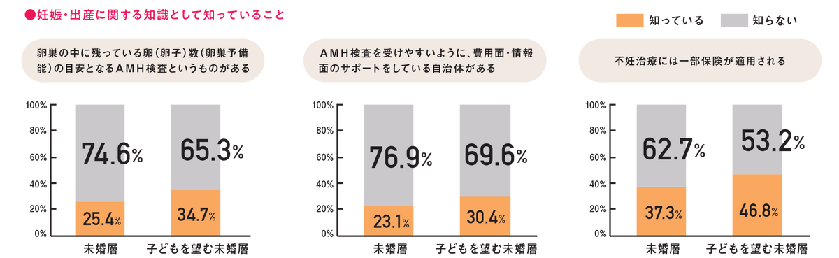 また、子どもを望まない理由としては、経済的な負担が大きな壁として立ちはだかる。特に大学生以降の教育資金への懸念など、将来の金銭的リスクを回避するために子どもを持たない選択をする層が増えている。これに対し、自治体によるAMH検査(卵巣予備能検査)の助成や不妊治療支援などの制度は存在するものの、制度そのものを認識している層は6割程度に留まっており、支援情報の周知が依然として不十分であることも普及の妨げとなっている。