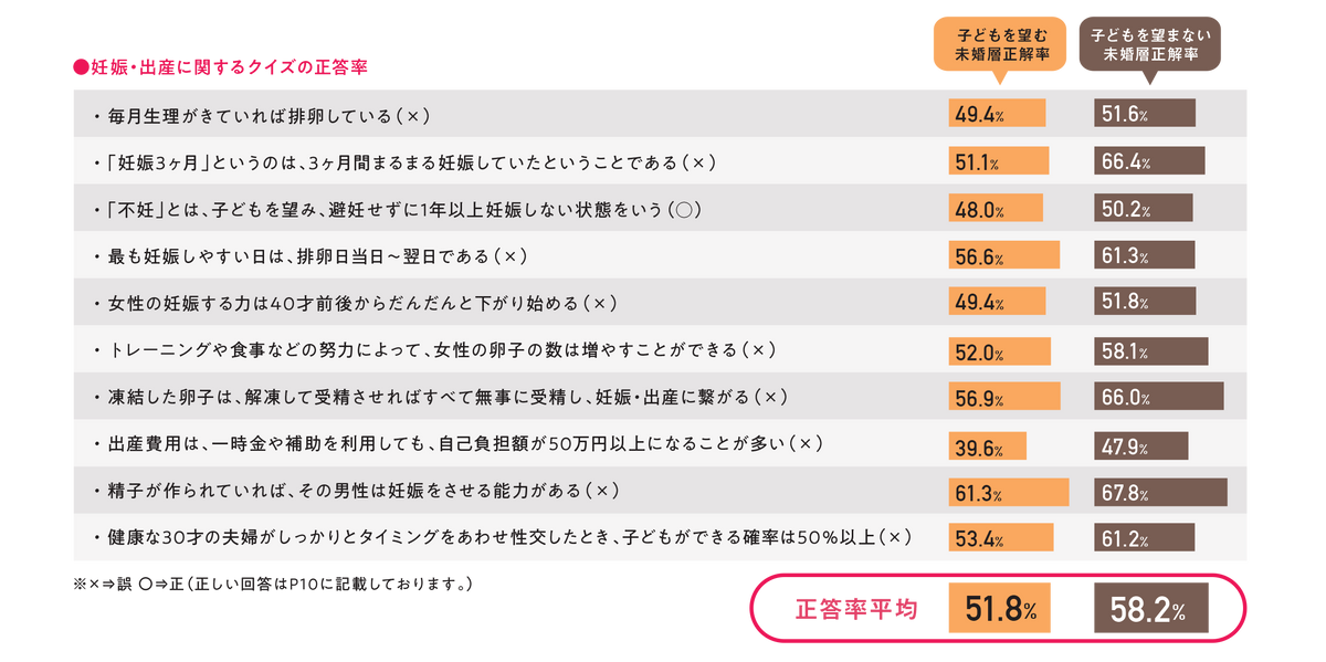 しかし、理想の時期が遅くなる一方で、生物学的な妊娠のしやすさやリスクに関する知識が追いついていない実態も課題だ。調査によると、将来的に子どもを望んでいる未婚男女であっても、半数以上が具体的な情報収集を始めていない。妊娠や出産に関するクイズの正答率スコアを算出すると、驚くべきことに、子どもを望んでいる層のほうが、望まない層よりも平均スコアが低いという逆転現象も確認された。この知識の欠如は、いざ「子どもが欲しい」と思った時に年齢的な壁に直面するリスクを高める要因となり得る。