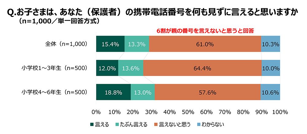 キー番号とは、171で伝言の録音と、それを聞くときに必要となる代表者の携帯電話番号または家の固定電話番号などのことを言う。そこで、自分の子どもが親の携帯電話番号を何も見ずに言えると思うかとの質問に、小学校低学年の母親の約64パーセントが「言えないと思う」と答えた。高学年の場合は約58パーセント、全体で約61パーセントだ。