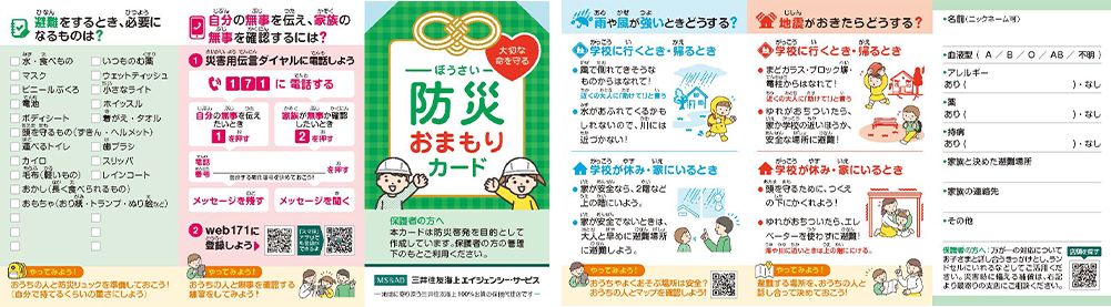 そこで三井住友海上エイジェンシー・サービスは、171の使い方が記された「防災おまもりカード」を全国120の拠点で配布することにした。これは「家庭内の防災ルール不足」を補うためのもので、171の使い方、防災時に必要なもののチェックリスト、防災時の心得が書かれており、個人情報やキー番号を記録するスペースもあり、子どもが持ち歩けるようになっている。
