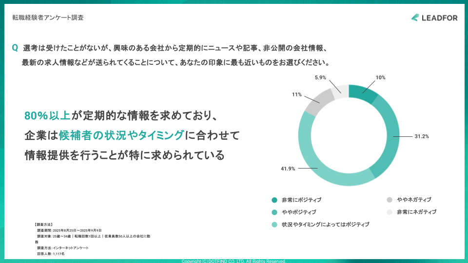 興味のある企業からの定期的な情報提供についても、80%以上がポジティブな反応を示した。「状況やタイミングによってはポジティブ」が41.9%と最多で、候補者が「今すぐ転職したい」状態でなくても、関係を維持することは受け入れられている。