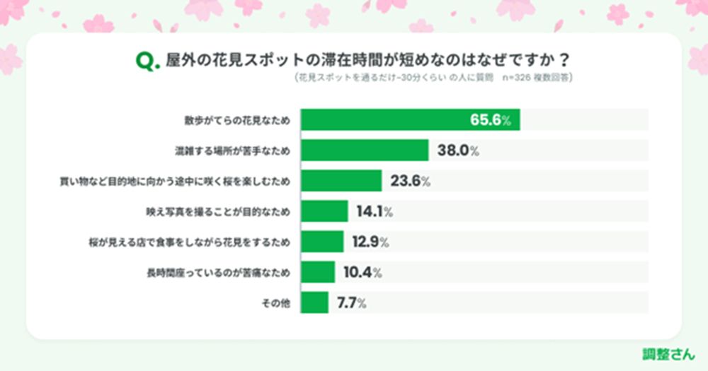 また、お花見会場にどれくらい滞在するかを尋ねると、30分以下が28%、40分から1時間ぐらいが約29%となった。滞在時間が短い理由を聞くと、散歩がてらだからという回答が約66%ともっとも多かった。次に多いのが、混雑する場所が苦手だからというもの。花見の悪いイメージが影響しているのか。花粉症や「まだ寒い」といった理由もあげられた。正直、お花見の季節に長時間外にいるのはしんどい。