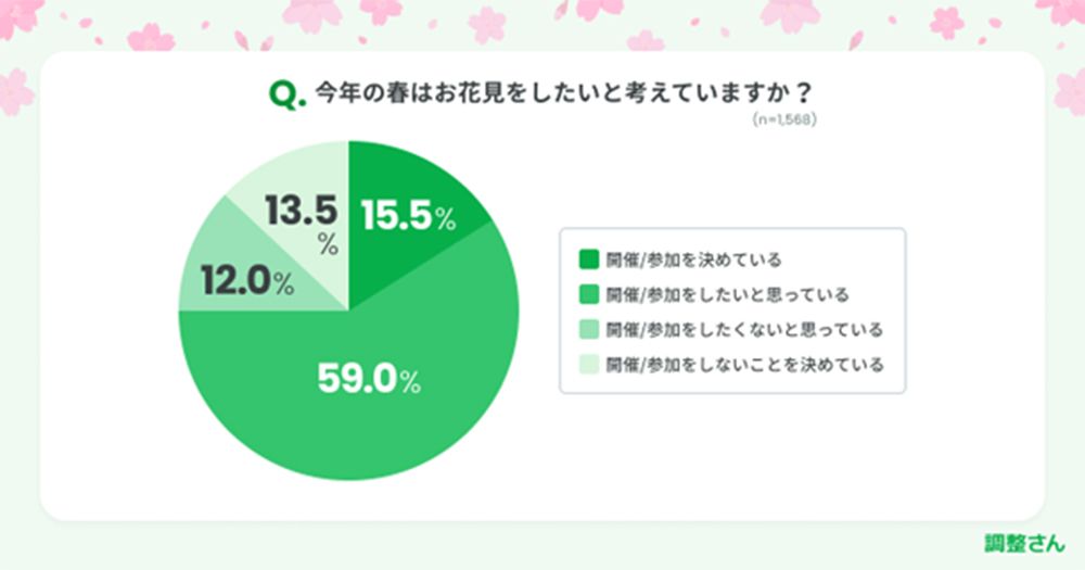 日程調整ツール「調整さん」を運営するミクステンドは、同ツールのユーザー1568人を対象にアンケート調査を行ったところ、事前に場所取りをしない予定の人が約8割にのぼった。また、お花見の滞在時間も30分程度と短いこともわかった。