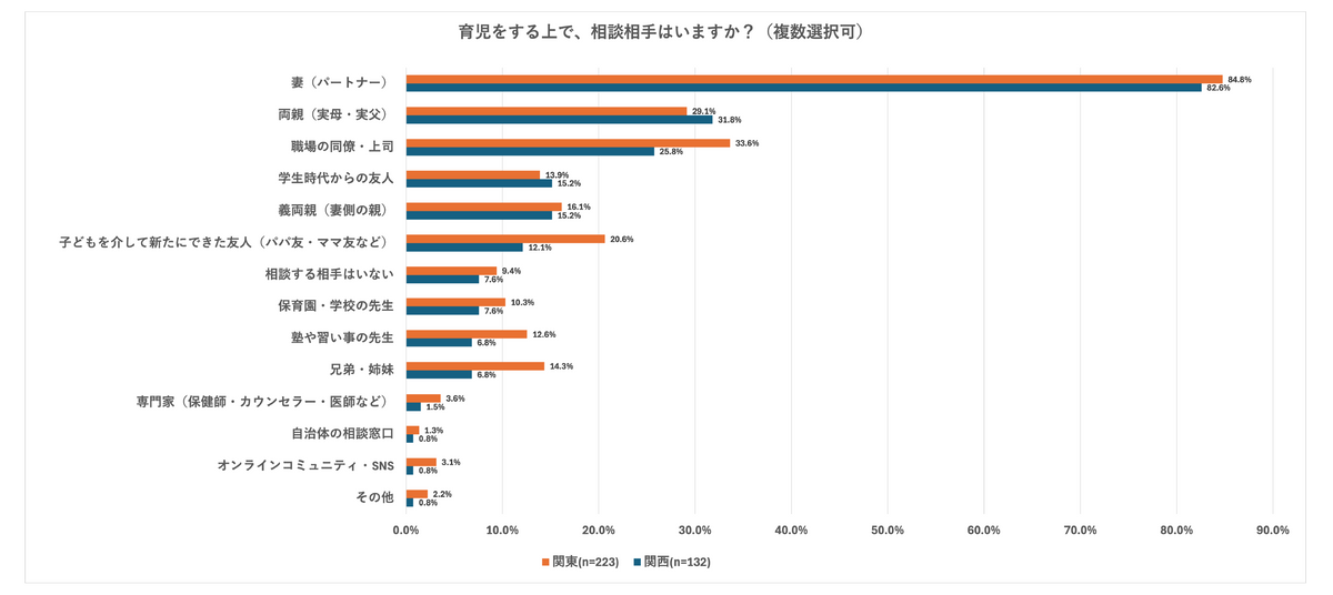 育児についての相談相手としてもっとも多かったのは「妻(パートナー)」、次いで「両親」「職場の同僚・上司」が続いた。ただし、この順位には東西差が見られる。関東では2位が「職場の同僚・上司」、3位が「両親」であるのに対し、関西では2位が「両親」、3位が「職場」となり、順位が逆転している。実際に、「職場で相談」は関東より関西のほうが低く、関西では育児に関する相談が家庭内に集まりやすい傾向が見られた。
