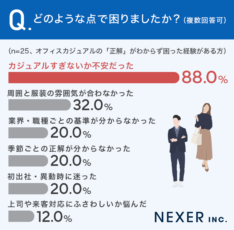 困った理由の内訳を見ると、「カジュアルすぎないか不安だった」が88.0%と圧倒的な1位。次いで「周囲と服装の雰囲気が合わなかった」(32.0%)、「業界・職種ごとの基準が分からなかった」「季節ごとの正解が分からなかった」「初出社・異動時に迷った」がそれぞれ20.0%と続く。