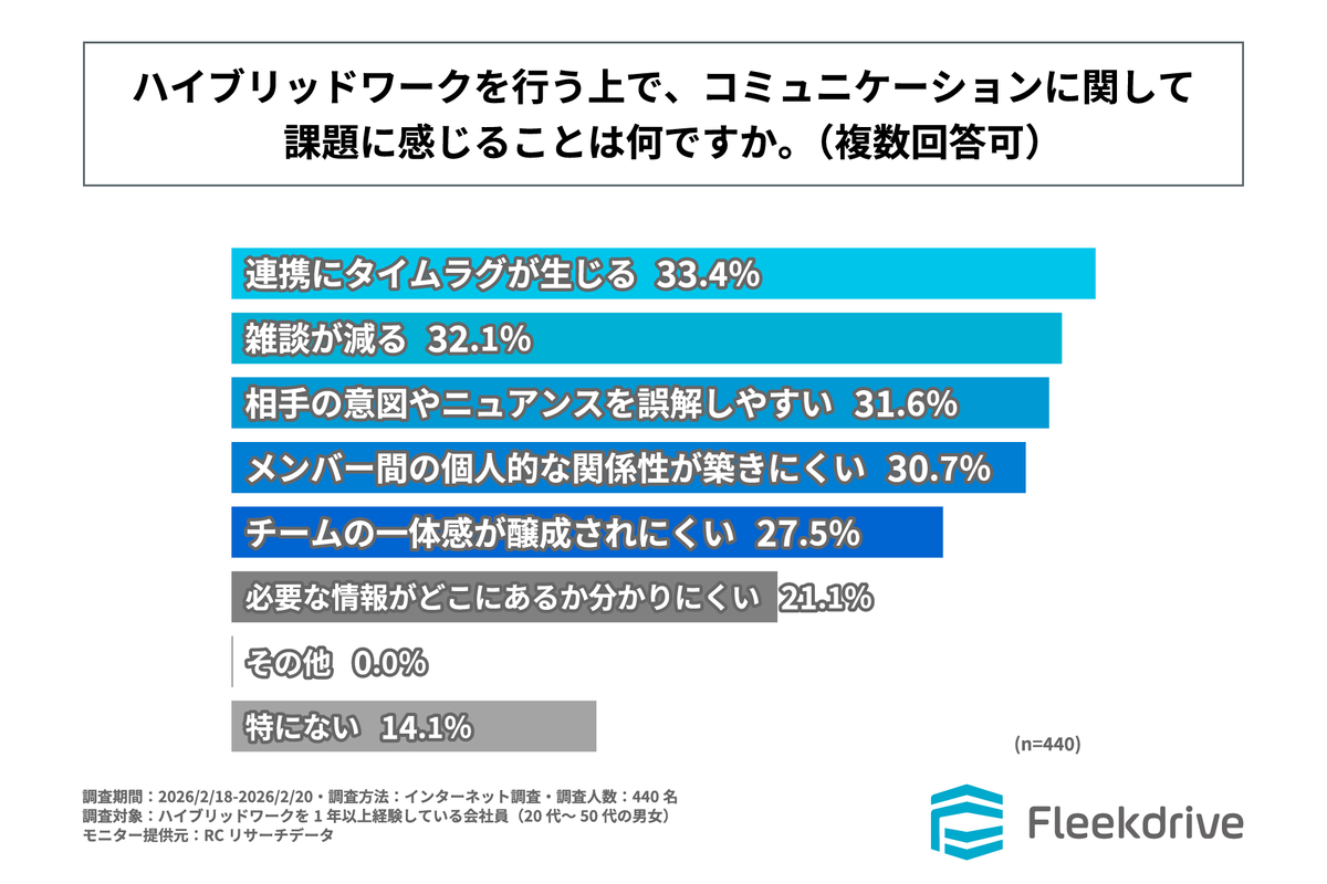 一方で、「生産性を低下させている」と感じている層が12.1%存在するのも事実。その理由として最も多かったのは「コミュニケーションが遅延するから」で58.5%。さらに「情報共有が遅延・煩雑化するから」が41.5%、「非対面の意思疎通が難しいから」で37.7%と続く。対面であれば数秒で済む確認がチャットやメールを介すことでタイムラグを生み、必要な情報にアクセスするまでの手間が増えることが、業務のブレーキとなっているようだ。また、「オンオフの切り替えが難しい」というメンタル面の課題を挙げる声も28.3%いた。