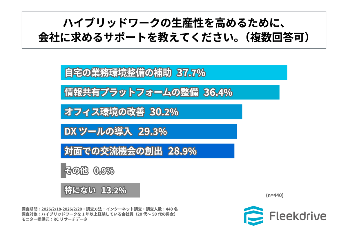 ハイブリッドワークの生産性をさらに高めるために、会社にどのようなサポートを求めるかという問いに対して「自宅の業務環境整備の補助」が37.7%で、「情報共有プラットフォームの整備」が36.4%、「オフィス環境の改善」が30.2%と僅差で続く。