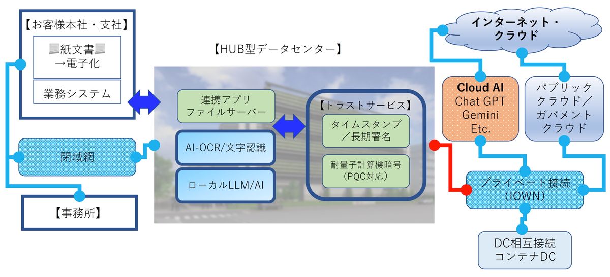 具体的なシステム構成は、企業の事務所や本社と、高度なセキュリティ環境を誇る「HUB型データセンター」を安全な閉域網で接続し、データセンター内に企業専用の「ローカルLLM(大規模言語モデル)」を搭載したAIサーバーを構築するというもの。