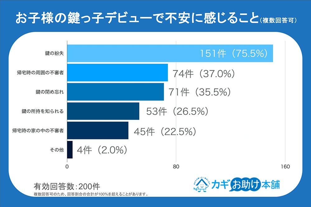しかし、両親は安心して持たせているわけではない。鍵を持たせることで不安なことを聞くと、いちばん多かったのが鍵の紛失。続いて帰宅時の周囲の不審者、鍵の締め忘れ、鍵の所在を知られるなどだ。