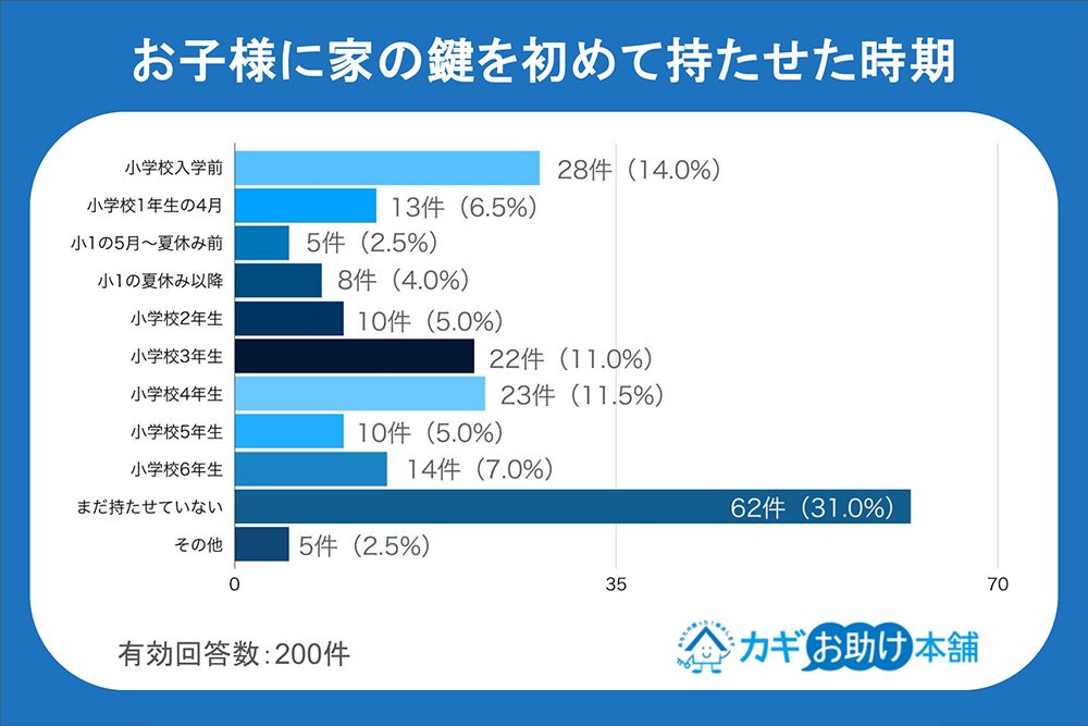 それによると、子どもに鍵を持たせている家庭は3割強あり、そのうち鍵を持たせた時期としてもっとも多かったのが小学校入学前だった。次に多いのが3年生と4年生。鍵を持っている家庭のうち、5割が4年生までに持たせ始めている。