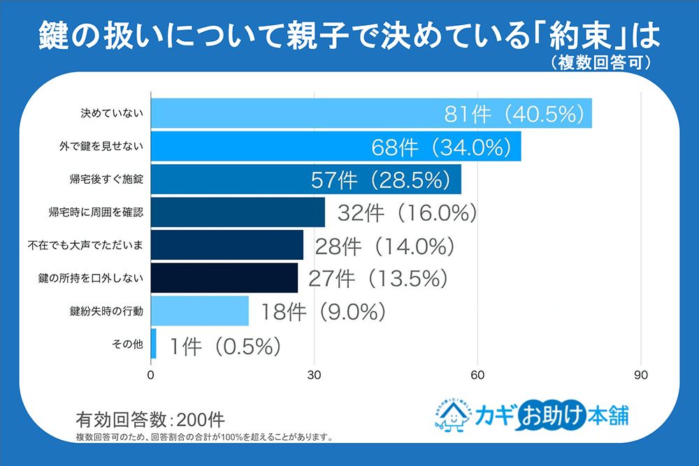 ところが、鍵の所持について、親子で決めていることを尋ねると、約4割は何も決めていないという。外で鍵を見せない、帰宅後すぐに施錠するなどの約束をしている家庭も少なくないが、不安は残る。そこで、鍵のお助け本舗が提言する、親子で決めておくべき鍵っ子のための防犯3カ条が参考になる。