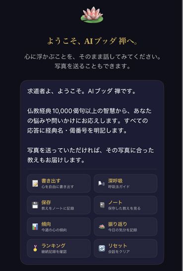 そのほか、ジャーナリングモード、気分の記録、教えの保存、深呼吸モードなど、心を和ませる数々の機能も備えている。これらは、プロンプトにその言葉を書けば対応してくれることになっている。たとえばジャーナリングなら「書き出す」と書いてから今の気持ちを入力し、最後に「おわり」と書けば記録される。また今の気分を、「不安」、「怒り」「疲れ」、「感謝」などと書けば記録される。週間の心の傾向は「傾向」と送信すると見ることができるといった具合。