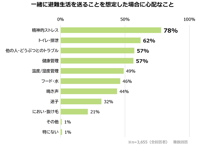 ペットとの避難生活で心配なことを複数回答で尋ねると、1位は「精神的ストレス」(78%)、2位「トイレ・排泄」(62%)、3位が「他の人・どうぶつとのトラブル」と「健康管理」(各57%)と続いた。物の備えが先行しがちな防災対策の中で、飼い主たちが実際に恐れているのは、ペットの心身の状態という事実が浮かび上がる。