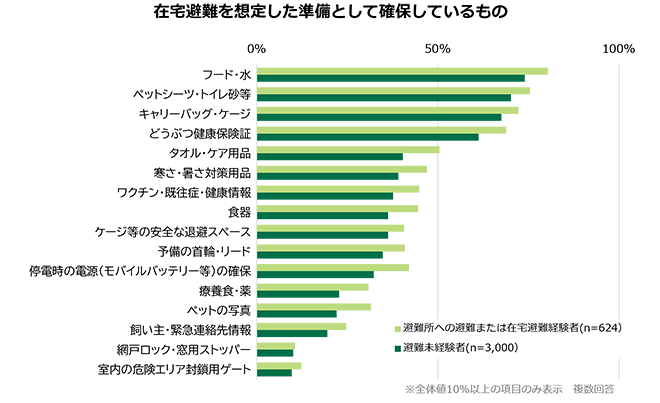 タオル・ケア用品の確保率は経験者51%に対し未経験者40%、停電時の電源は42%対32%、ペットの写真は32%対22%と、いずれも10ポイント以上の開きがあった。動物を清潔に保つ、明かりを確保する、万一の迷子に備えて顔写真を手元に置くといった備えが、実体験を経て初めて優先事項となることを示している。