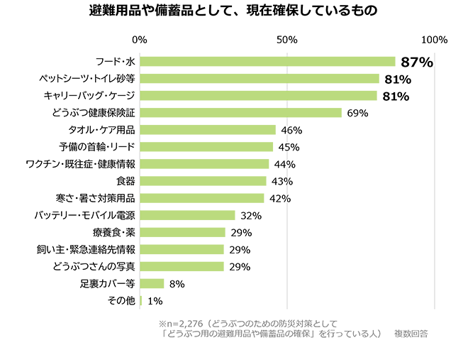 ペットのための備えとして最も多かったのは「避難用品や備蓄の確保」で、対策をとっている人の8割以上がフード・水(87%)、ペットシーツ・トイレ砂(81%)、キャリーバッグ・ケージ(81%)を準備済みと答えており、フード・水の備蓄量では「30日分以上」が最多(24%)と、長期化を見据えた意識も見てとれる。