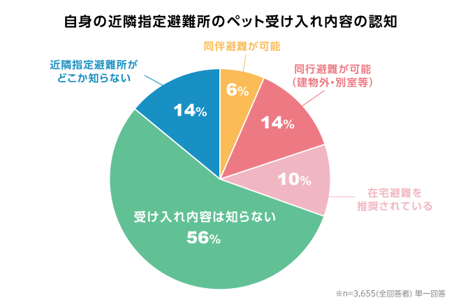 一方、防災対策が進まない最大の理由として挙がったのは「避難所の体制が不明で不安」(53%)だった。自宅や車内を選ぶ背景には、避難所に関する情報がそもそも届いていないという現実がある。近隣の指定避難所がペットを受け入れているかどうかを把握している飼い主はわずか30%にとどまり、56%が「受け入れ内容は知らない」と答えている。