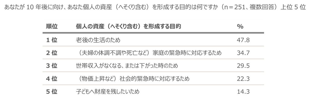 10年後に向けた資産形成の目的として最も多かったのは「老後の生活のため」で、「緊急時への備え」「収入減への備え」が続いた。将来への不安に備える意識が中心となっている。