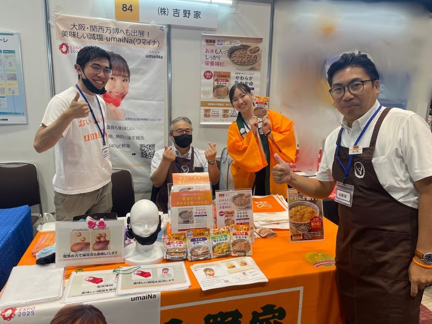 さらに、2022年のピッチイベントで、吉野家のケア営業との出会いも、福島の大きな後押しとなった。吉野家ではすでに介護施設向けの減塩牛丼を展開しており、好評を得ていた。一方で、さらなる味の向上方法も模索していた。そこにumaiNaのプロトタイプを組み合わせたところ、おいしさを増強できる可能性が見えてきた。「吉野家からも、このアプローチは可能性もあり、新しいと評価いただきました」。この出会いをきっかけに、学会での共同展示も実現した。福島にとって大きな自信となった。