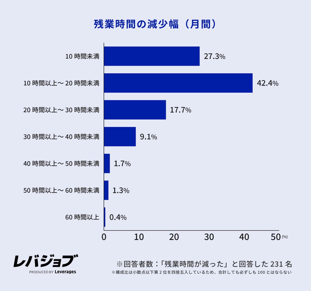それによると、規制適用後の残業時間の変化について、約4割が「減少した」と回答。減少幅としては「10時間以上〜20時間未満」が42.4%と最も多く、一定の残業削減効果が見られる形となった。