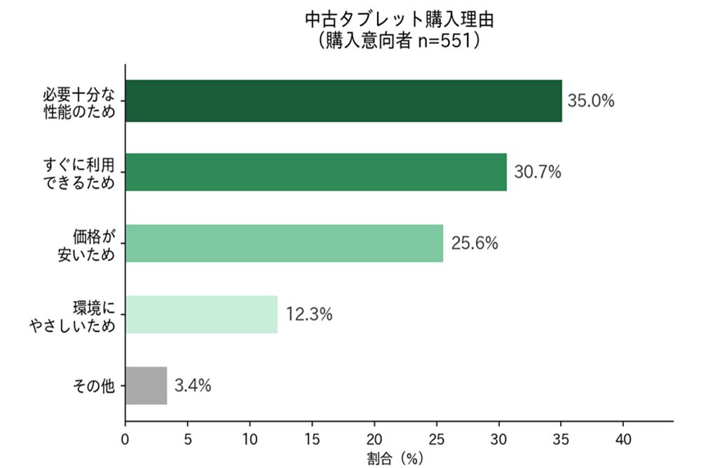 そこで、中古タブレットを購入した、または中古品の購入を予定している551人に、中古を選んだ理由を聞いてみた。すると、1位は「必要十分な性能のため」だった。2位は「すぐに利用できるため」となり、価格を理由とする人の割合は比較的少なく3位だった。