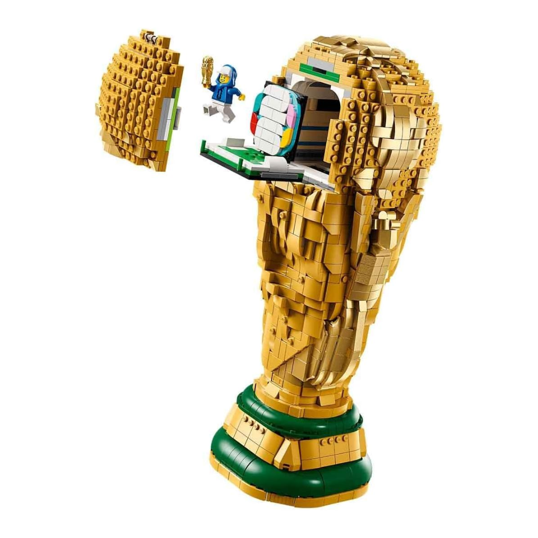 そんな栄誉あるトロフィーを実寸大スケールで精巧に再現したのが、レゴ(LEGO)から登場した「レゴ エディション FIFAワールドカップ 公式トロフィー」。2842個のレゴブロックで構成されていて、トロフィー上部の球体部分にあるスリップを引き出すとサッカー場でのワンシーンが現れるギミックも備わっている。