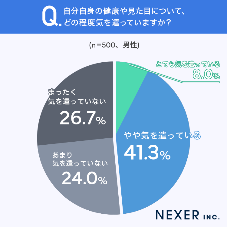 一方で、自分自身の健康や見た目に気を遣っていると回答した男性は49.3%と約半数にとどまった。重要性は理解しつつも「面倒」や「気にしてもメリットがない」といった理由から、具体的な行動に移せていない人が多いことがわかる。