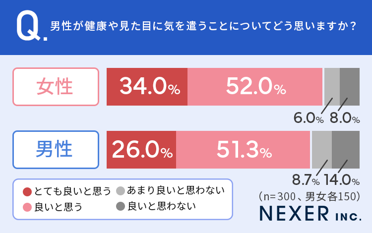 NEXERとMSクリニックが実施した調査によれば、男性が健康や見た目に気を遣うことに対し、女性の86.0%が「とても良いと思う」または「良いと思う」と肯定的な反応を示している。これに対し、男性自身が肯定的な回答を寄せた割合は77.3%にとどまり、両者の間には約9ポイントの意識の差が存在する。つまり、男性が自分自身で考えている以上に、周囲の女性は男性が外見に気を配ることを好意的に捉えているようだ。その理由として「清潔感があるほうが好感が持てる」「社会人としてのマナー」という声が目立っていた。