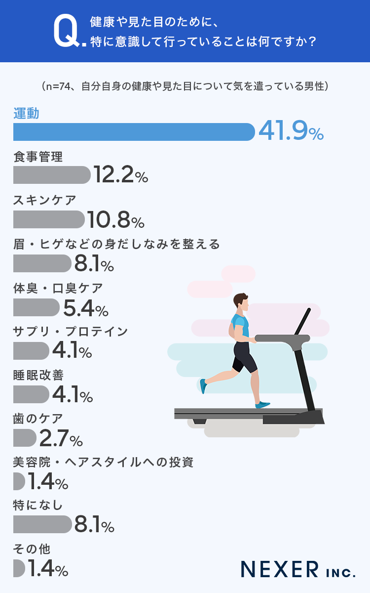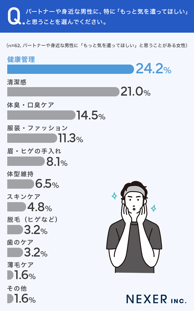 具体的な取り組み内容を詳しく見てみると、意識的に行っていることとして「運動」を挙げた男性は41.9%に達し、体力維持や健康管理への関心の高さがうかがえる。しかし、女性側が身近な男性に対し「もっと気を遣ってほしい」と感じている要素は、必ずしも運動だけではない。女性が求める改善点として最も多いのは「健康管理」の24.2%だが、次いで「清潔感」が21.0%、「体臭・口臭ケア」が14.5%と続く。
