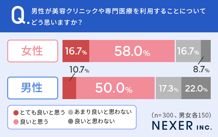 こうしたセルフケアの限界を補う手段として、専門機関への期待も高まっている。男性が美容クリニックや専門医療を利用することについて、女性の74.7%、男性の60.7%が肯定的に捉えている。自分一人では解決が難しい肌トラブルや身だしなみの悩みに対し、専門家の力を借りることは、もはや特別なことではなく、効率的で確実な選択肢として受け入れられているようだ。
