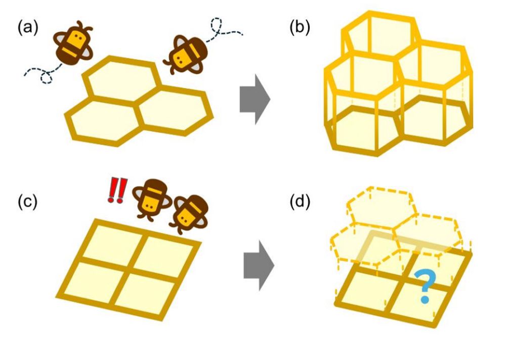どちらも機械的な単純作業と自然の作用の結果であることを示している。はたしてそうなのかと、山梨大学の島弘幸教授は疑問を抱いた。そこで、養蜂でハチに巣を作らせる際に使用する巣礎シート(高さ約1ミリの六角形の巣の土台が並べられた蜜蝋製の板)を使い、六角形の代わりに四角形の土台を並べ、それをミツバチに与えてみた。