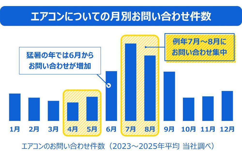 今の時期に試運転を行うべき理由は2つ。暑くなってからエアコンを使おうとして不具合が見つかるケースが非常に多いこと(7月上旬が最多)、そしてその時期に点検依頼が集中して混み合ってしまうためだ。すぐに修理に来てもらえない恐れがある。それに対して、冷房も暖房も使わない4月は点検依頼がもっとも少ない時期となっている。