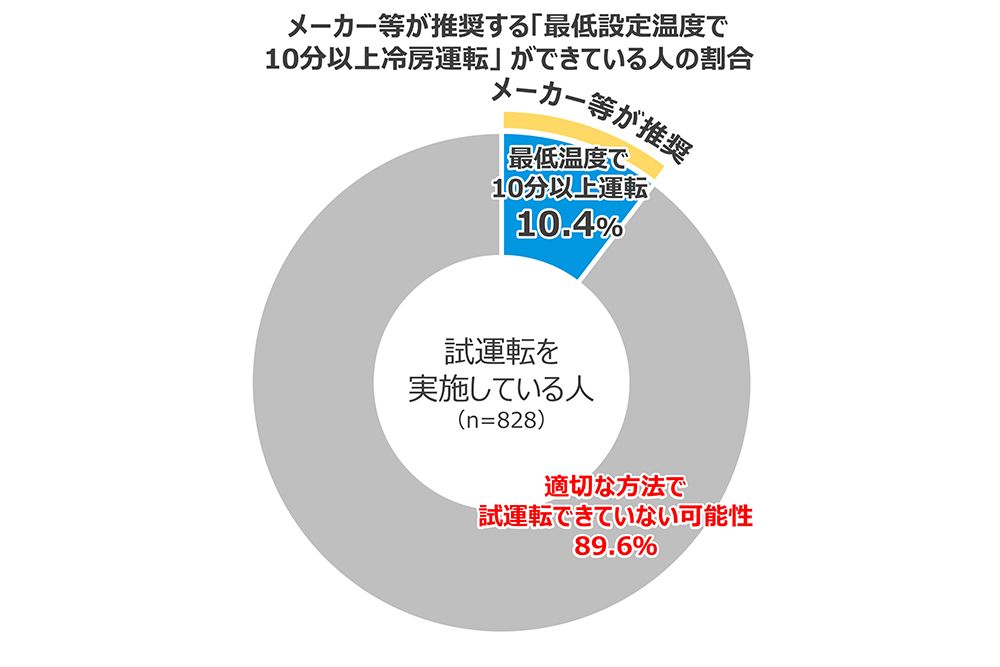 ダイキンは、全国3000人の男女を対象に「エアコン試運転の実施方法等に関する調査」を実施したところ、約28パーセントの人が試運転を行っていると答えた。ところが、ダイキンが推奨する正しい方法で行っている人は、実施者のうちわずか10パーセント程度だった。