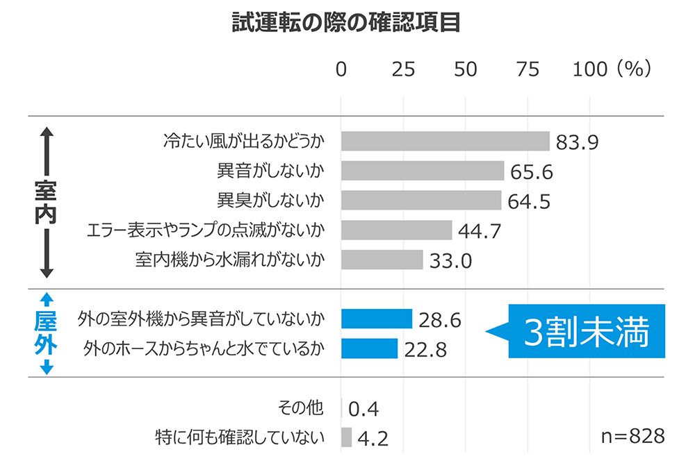 そこで確認すべきことは、冷たい風がちゃんと出ているか、異音、異臭がないか、エラー表示がないか、室内機から水漏れがないかなどだ。水漏れまでチェックしている人は少数だ。室外機の点検まで行っている人はさらに少なくなる。点検ポイントは、室外機の異音、外の排水ホースの詰まりの有無だ。